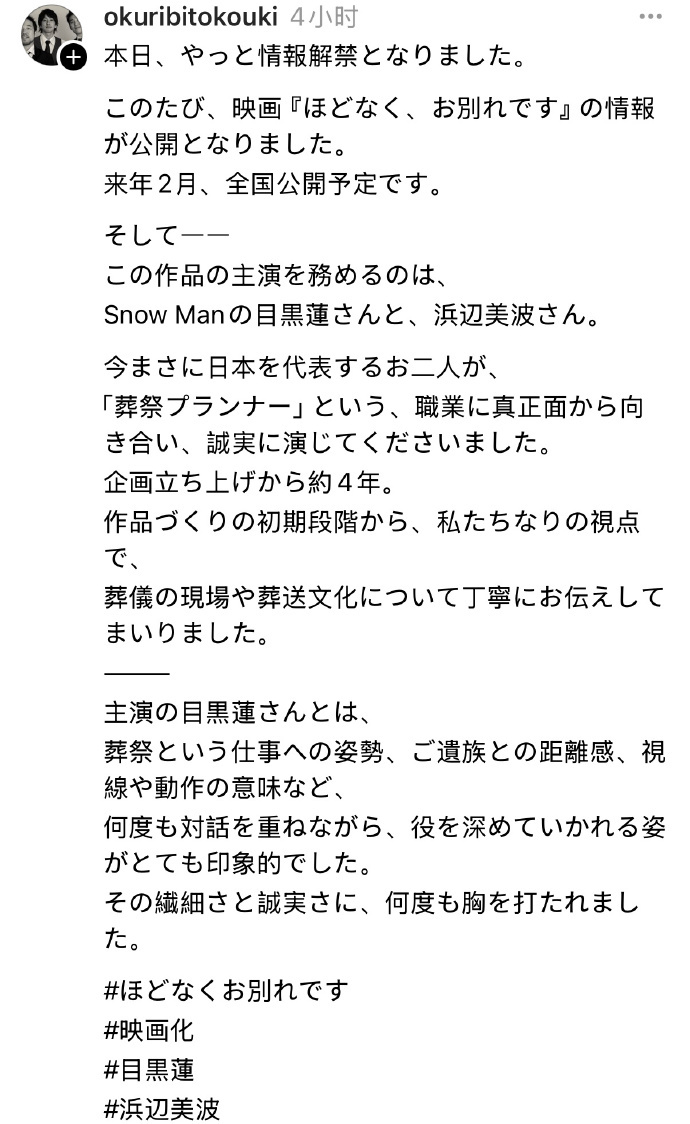 电影《不久,就要告别了》将于2025年2月中旬至3月下旬进行拍摄,影片将于2026年2月在日本上映。